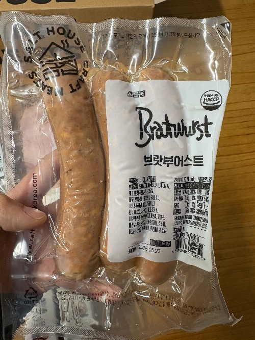 제가 받은 건 브랏부어스트였어요. 독일식 화이트 소시지로, 풍부한 육즙과 부드러운 식감이 특징이에요.