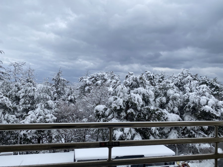 거실 창문으로는 처참한 지상주차장의 모습을 볼 수 있었다 ㅋㅋ 남편은 아침에 눈뜨자마자 내려가 차에 쌓인 눈을 치웠고, 직원분들도 이른 아침부터 눈을 치우고 계셨다.