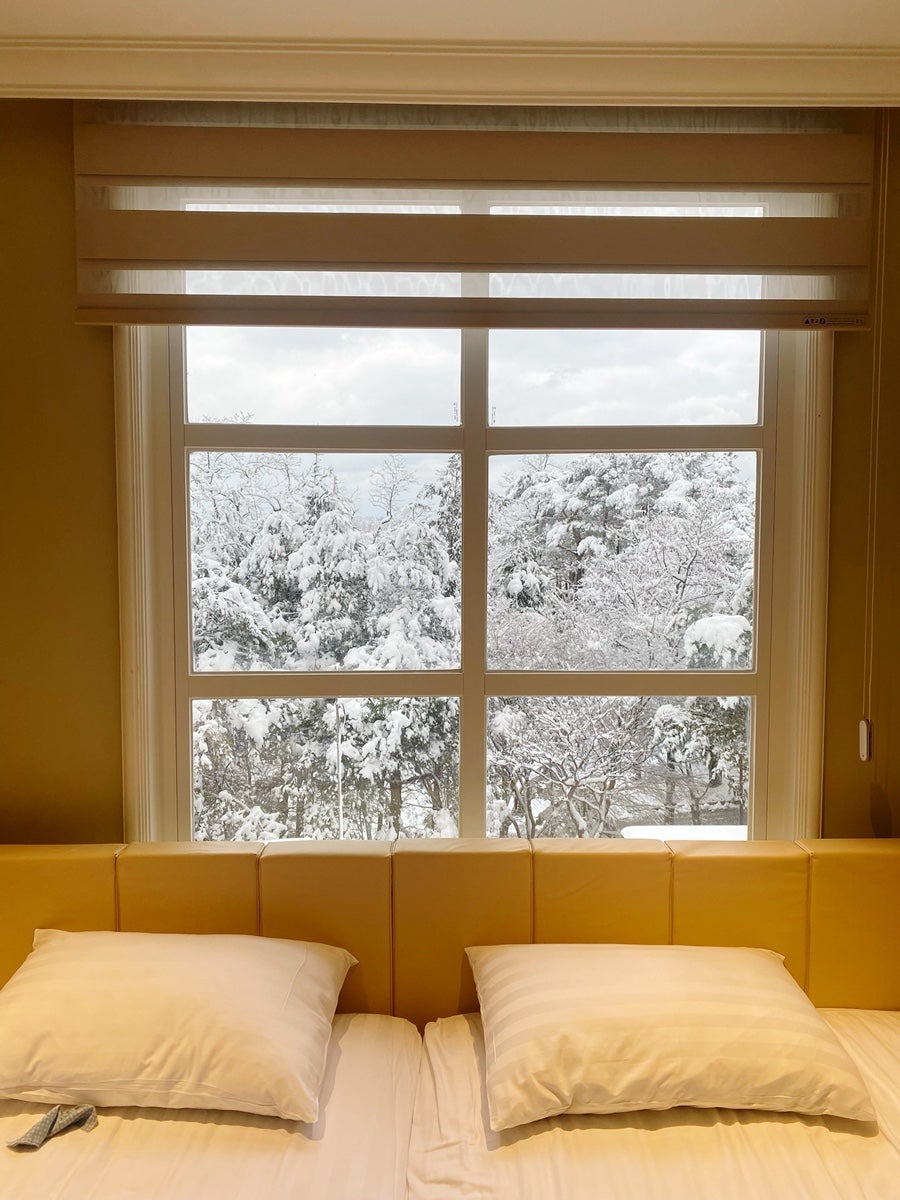 다음 날 아침 침실의 블라인드를 걷으니 그야말로 겨울왕국이 되어 있었다. 사진에 담기지 않는 장관이었는데 높은 층에서 바라보는 뷰는 더 좋았을 것 같다.