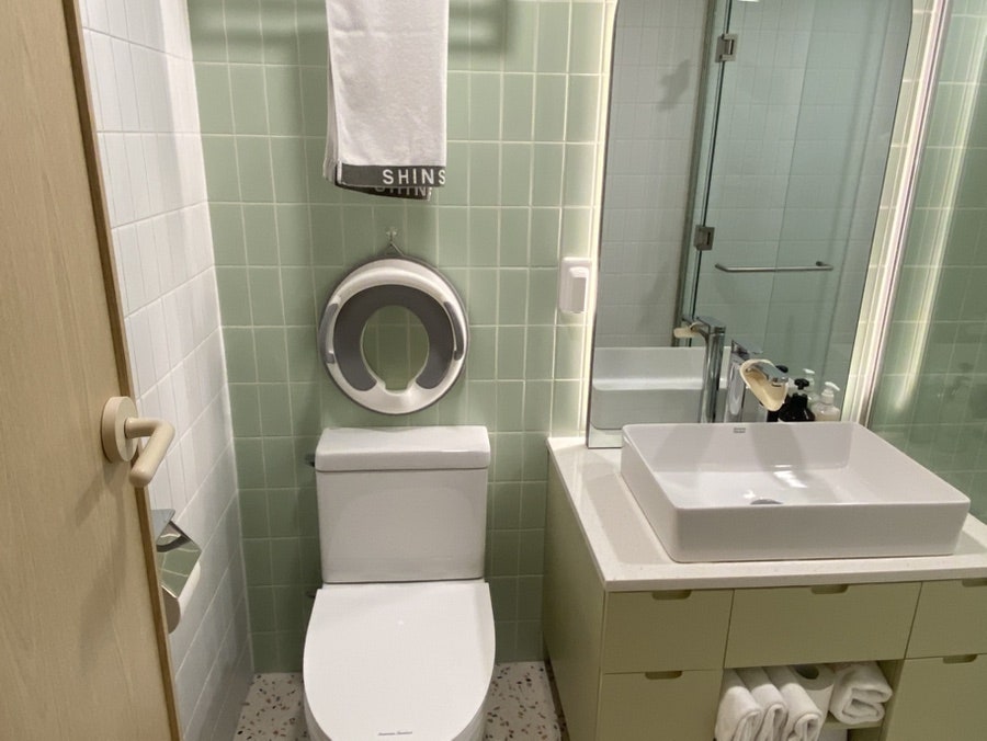 욕실에 욕조는 없지만 화장실도 리뉴얼되어서 깨끗하고 아이들 이용을 위한 변기커버와 발판, 유아용 어메니티도 준비되어 있어서 편리했다.