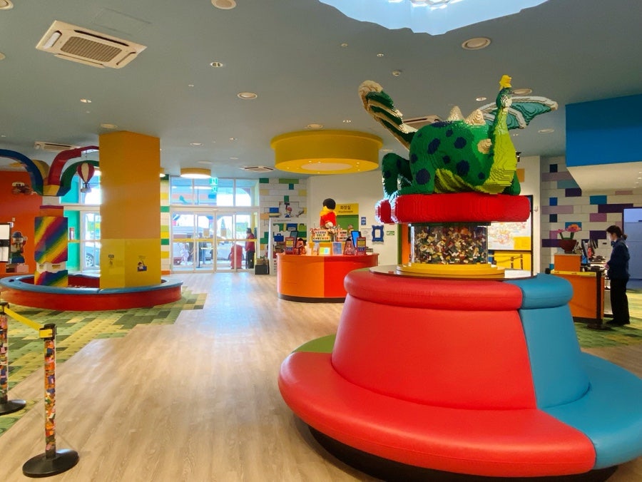 눈이 살짝 흩뿌리는 날, 드디어 레고랜드호텔에 도착했어요! 로비를 보자마자 아이가 뛰어들어갔습니다. 레고로 아기자기하고 알록달록하게 꾸며져 있었거든요. 레고로 만든 커다란 용부터, 움직이는 미니 열기구까지 어른들도 보자마자 기분이 좋아지는 레고 세상이었습니다.