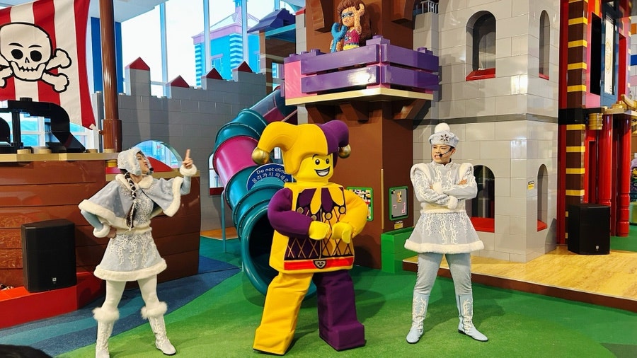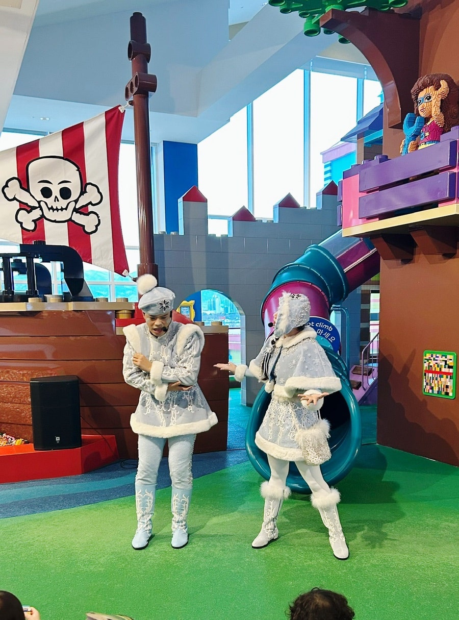 계절별로 공연 내용이 바뀌는 것 같았는데, 겨울에는 어린이들의 소원을 소재로 한 윈터위시 공연이 진행되었습니다. 약 20분 정도의 짧은 공연으로 배우 두 분이 진행하지만, 아이들 참여형이라 모두 신나했어요. 레고 인형까지 나오니 더욱 그럴싸했습니다!