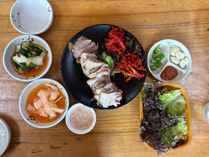 따끈따끈하게 데워진 수육은 지방과 살코기 비율이 딱 좋았고, 무엇보다 퍽퍽하지 않아서 끝까지 촉촉하게 잘 먹었어요. 곁들여 나온 달콤하고 매콤한 무말랭이 무침과 명태회무침이 정말 찰떡궁합! 특히 명태회 살짝 얹어서 먹으니, 막걸리 한잔 생각나는 그런 맛이더라고요.