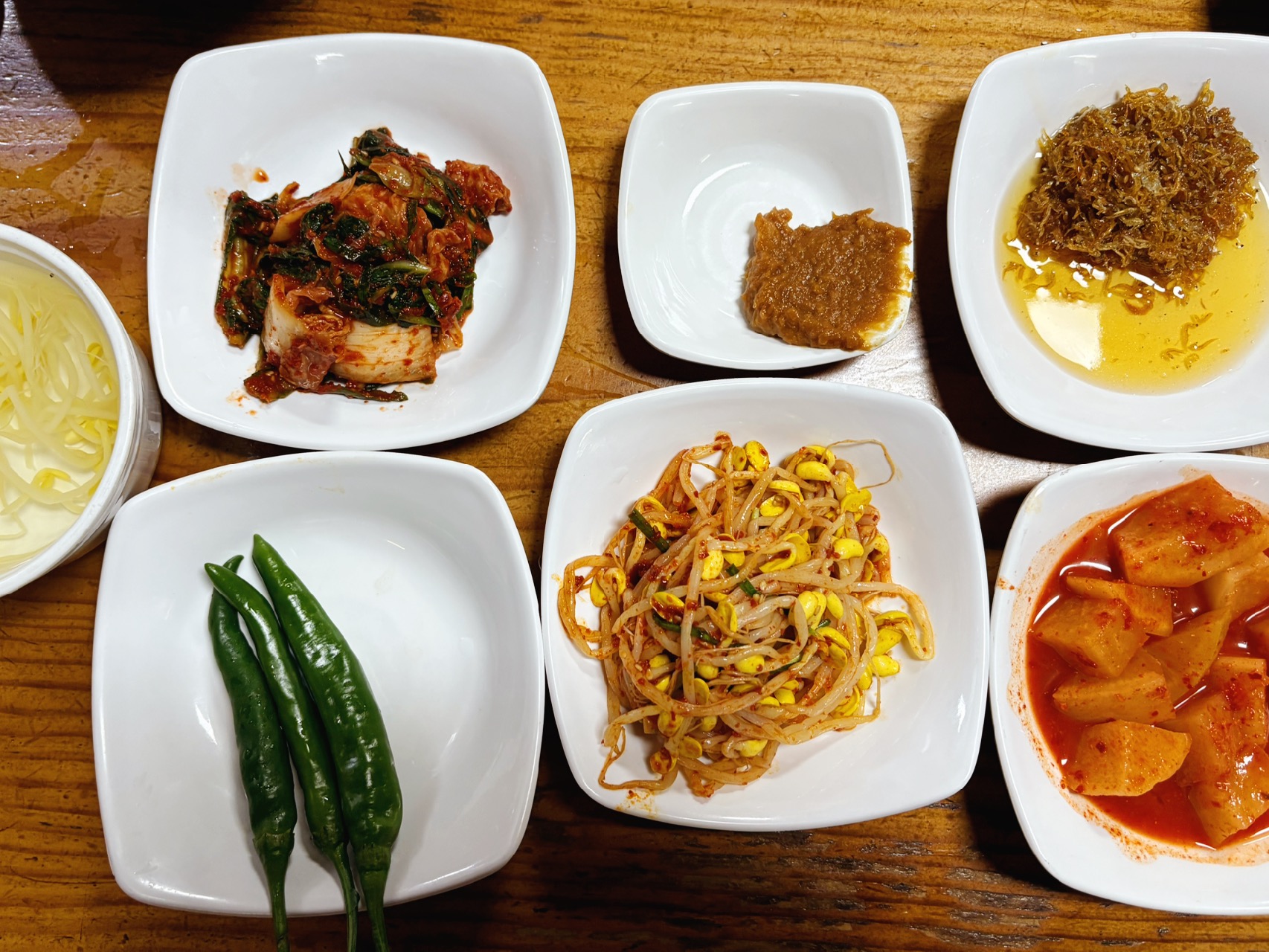 기본 상차림 반찬 너댓가지 정도가 나오는데 오른쪽 위 잔멸치조림이 달콤해서 아이들 밥도둑하기 좋은 메뉴다. 육회비빔밥을 시키면 콩나물국도 하나 같이 나온다.