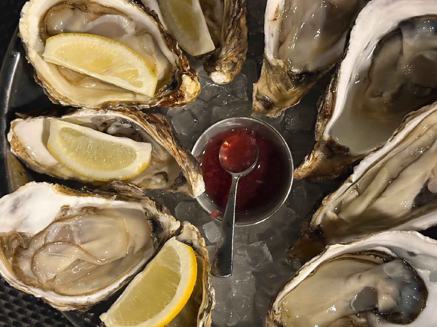 제철굴을 10피스 정도 시켰더니 얼음 위에 시원하고 예쁘데 하프쉘로 손질되어서 나왔다.
