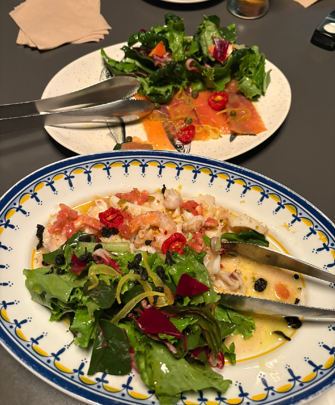 월간식당은 퓨전 요리를 선보이는 곳이라 다양한 국적의 메뉴들이 많았다. 우리는 이날 훈연생연어샐러드와 안경석마늘버터갑오징어볶음, 어린양타코를 시켰다.
