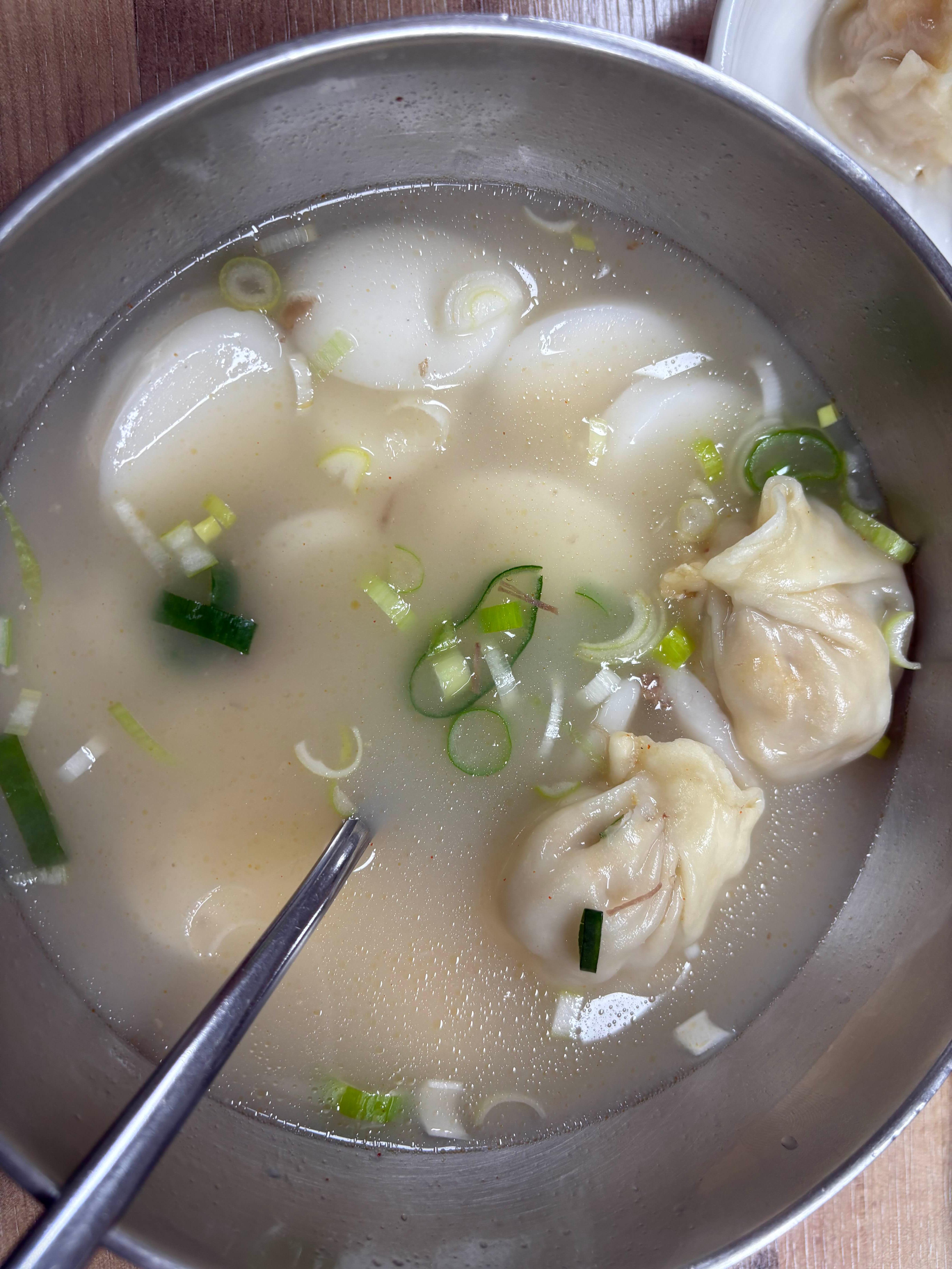 떡만두국을 시키면 만두 세알과 떡이 함께 나오는데 떡의 전분때문인지 일반 떡만두국 보다는 걸죽한 국물입니다. 떡도 쫄깃하고 맛있어서 좋았습니다.