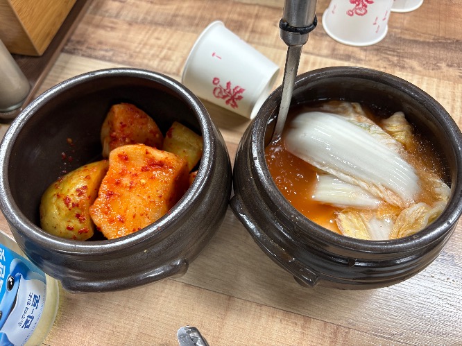 기본 반찬으로 제공되는 석박지와 상큼한 물김치입니다. 석박지는 많이 맵지 않아서 만둣국과 함께 맛있게 먹었고, 별미인 물김치는 국물이 새콤하고 시원해서 식사 전 입맛을 돋우기에 좋았습니다. 먹을 만큼만 덜어서 먹기 때문에 깔끔해서 좋았습니다.