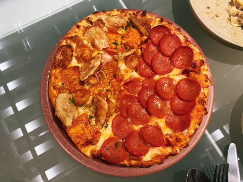 메종파이프그라운드의 시그니처인 옥수수피자와 클래식한 페퍼로니 피자를 반반으로 주문했습니다.