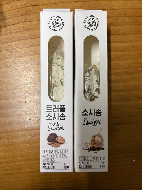 요건 진짜 고급진 맛! 트러플 향이 은은하게 퍼지는 미니 살라미 스타일인데, 잘라놓고 친구들과 와인 한잔할 때 딱이에요. 저는 선물해준 지인이 기본 소시송도 추가해서 보내준 것 같았어요!