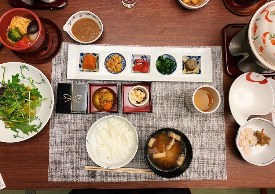 료칸 여행의 하이라이트는 역시 가이세키 정식이죠. 유모토칸에서는 석식과 조식 모두 가이세키로 즐길 수 있는데, 체크인할 때 미리 식사 시간을 예약하는 시스템입니다.