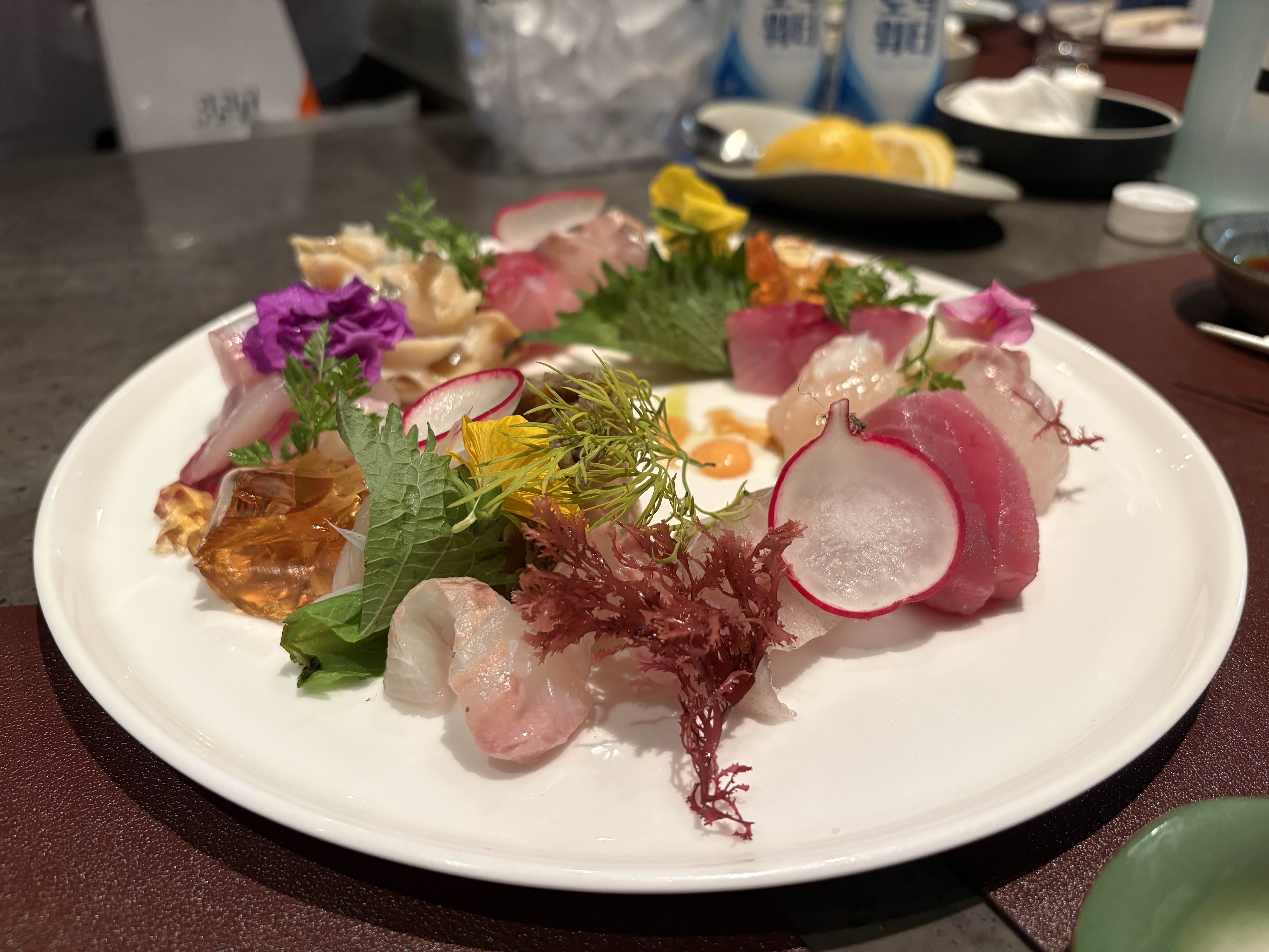 여울 다이닝의 사시미 플레이트는 비주얼부터 훌륭했어요. 신선한 생선들이 정갈하게 플레이팅되어 나왔고, 구성도 꽤 다양했습니다. 광어, 참치 등 기본적인 회부터 기름진 식감이 좋은 청어류와 관자, 전복찜과 백골뱅이숙회가지 밸런스 있게 들어 있었어요.