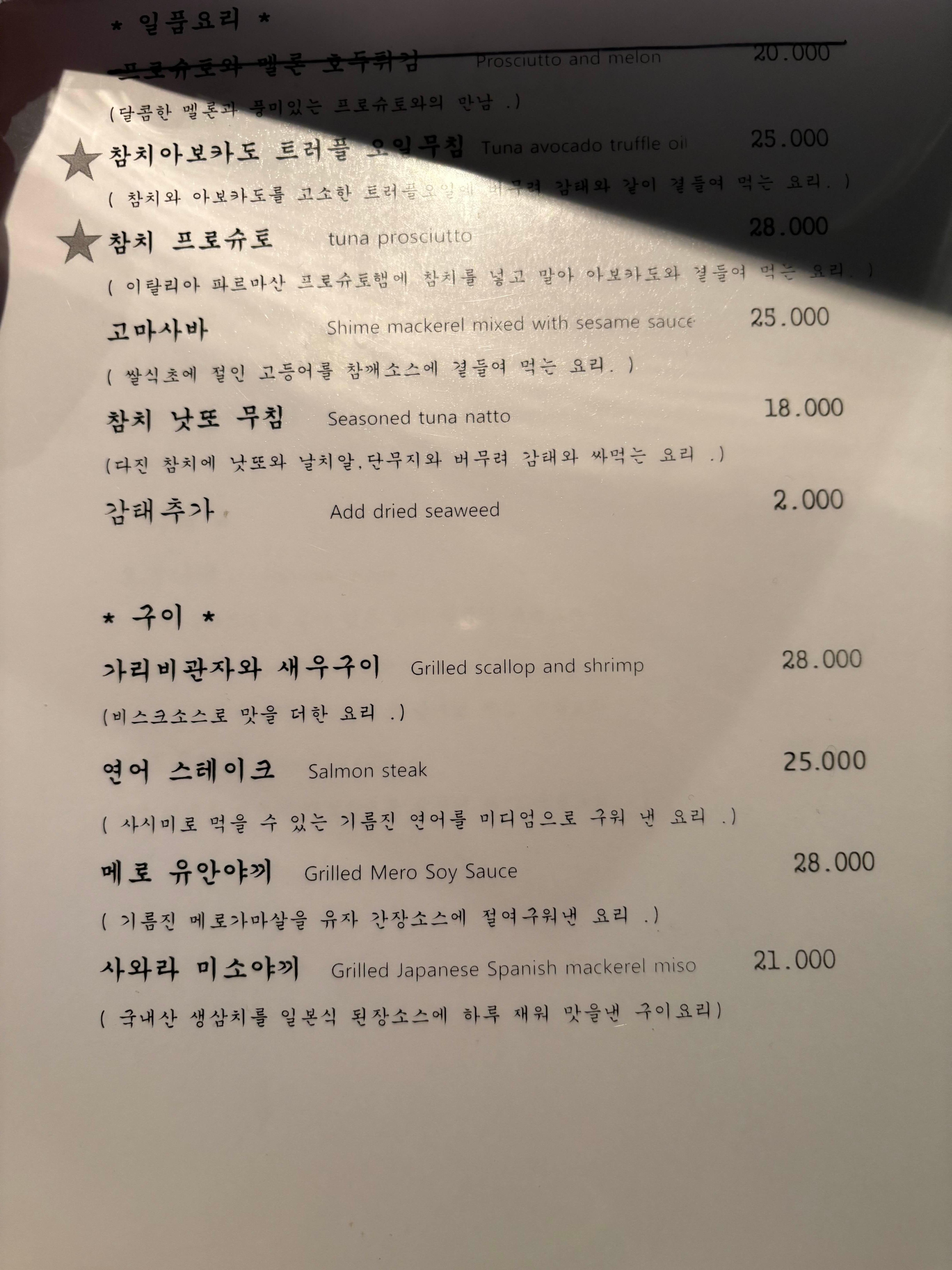 메뉴판은 아래와 같고 그날 그날 재료 수급에 따라 주문 가능한 메뉴들이 조금씩 바뀌는 것 같았어요.