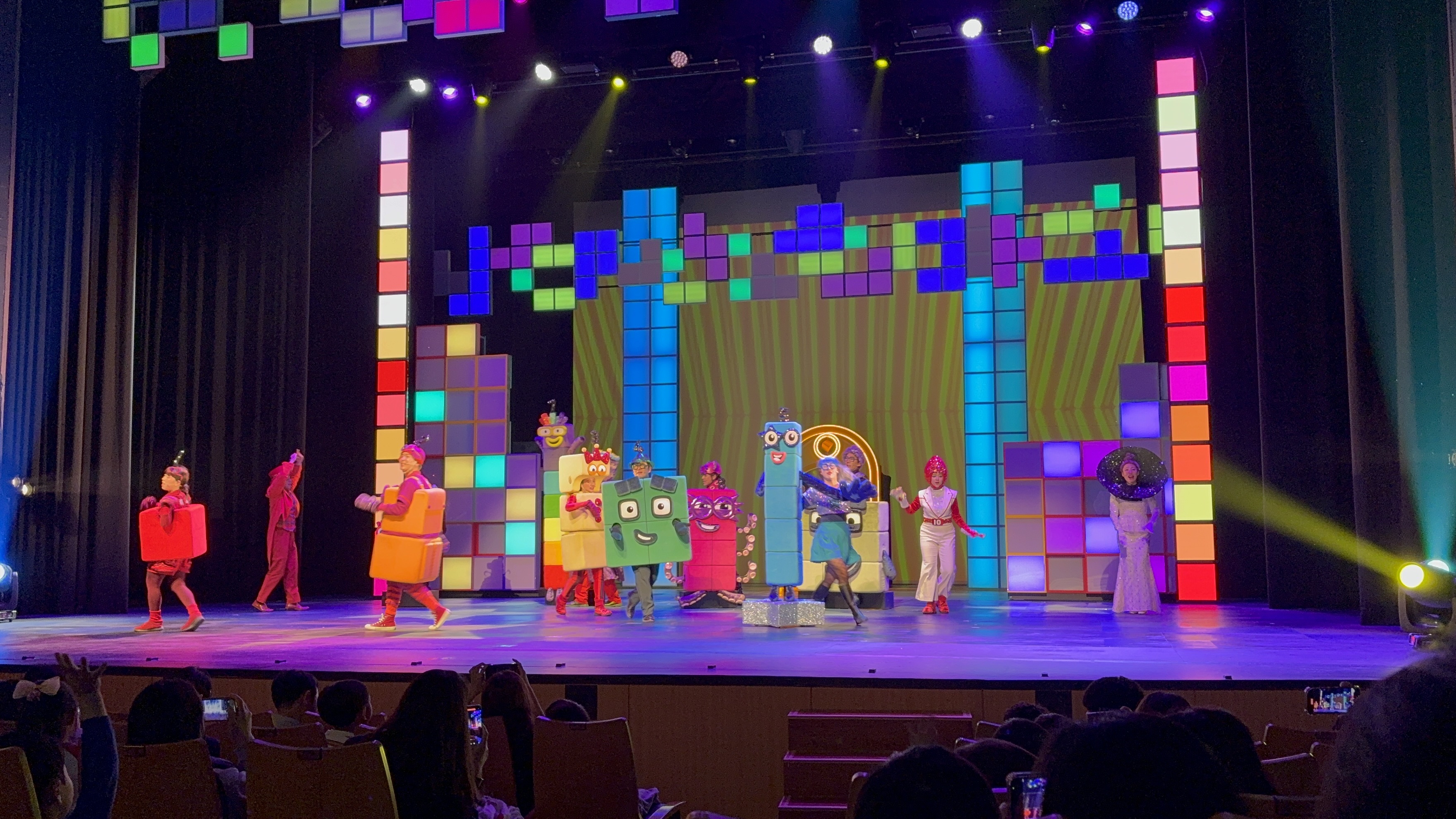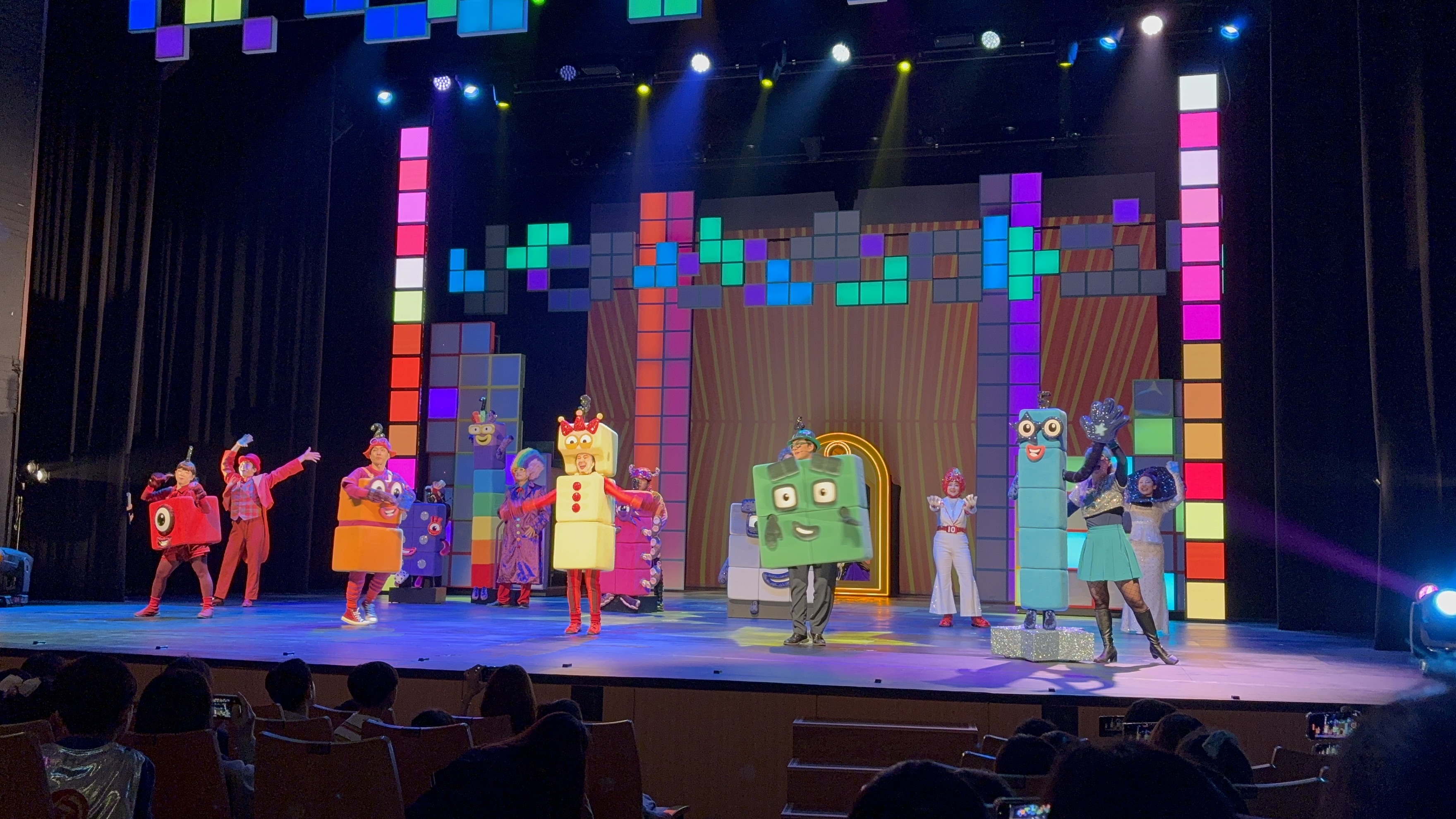 무대 장치도 아이들 눈높이에 맞춰 정말 고민한 흔적이 느껴졌어요. 캐릭터들의 크고 알록달록한 블록 형태, 변형되는 무대 구조, 아기자기한 소품들까지—시각적으로도 재미를 더해주었어요.
