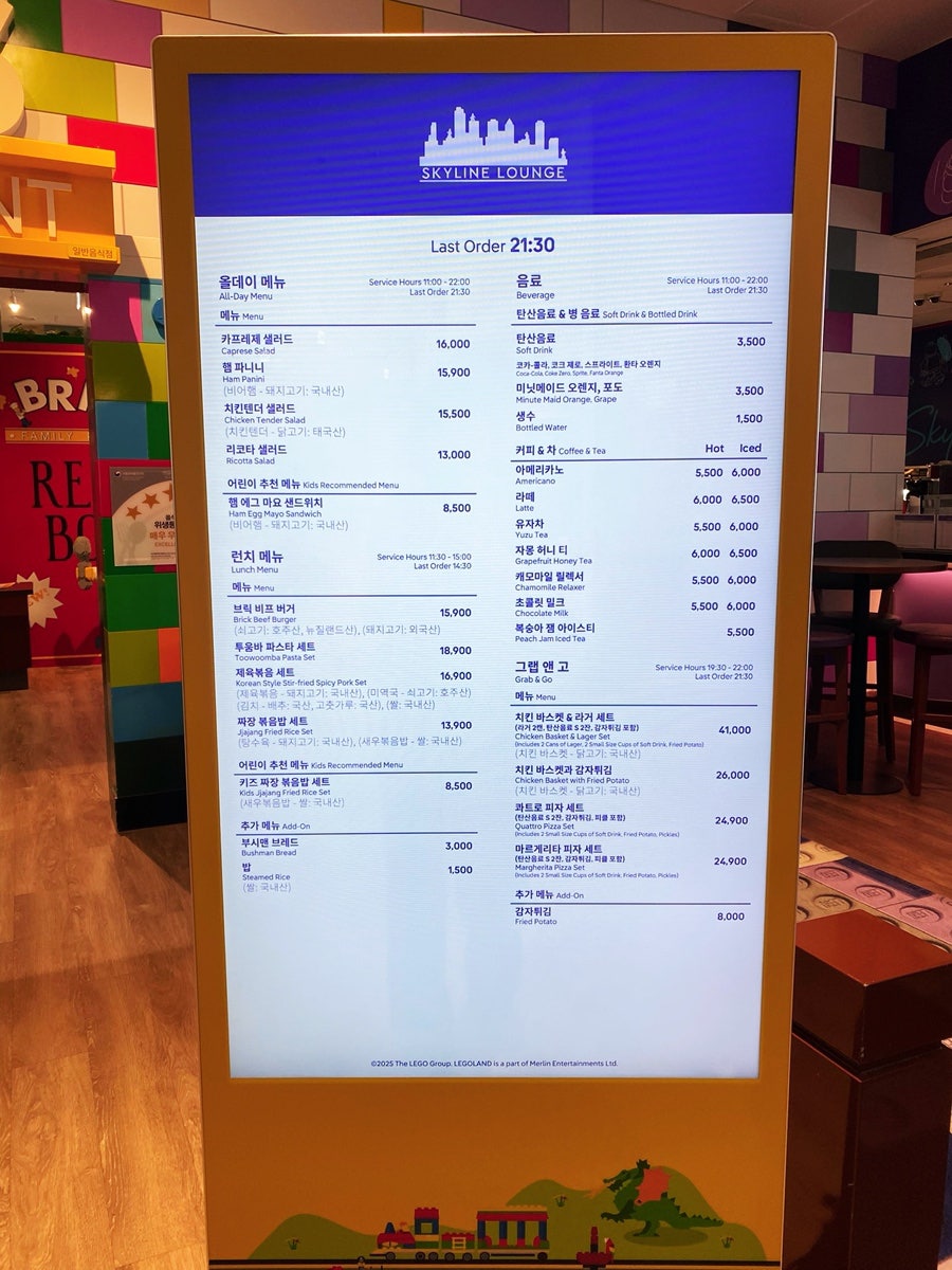 레고랜드 호텔 주변에는 아무것도 없어서 호텔 안에서 식사를 다 해결하거나 배달을 해야 하는데, 리조트 식당 치고는 가격이 매우 저렴한 편이었어요.