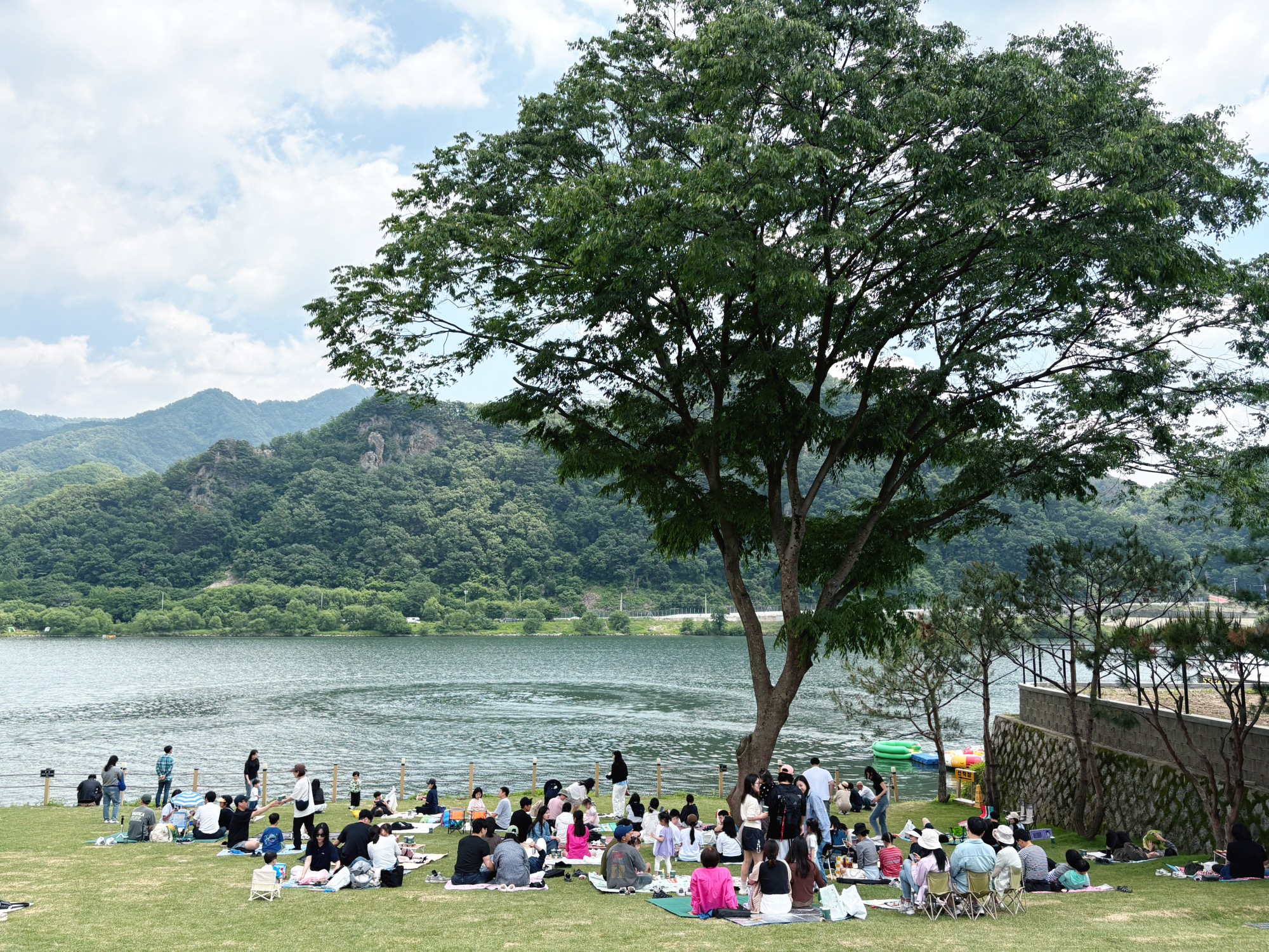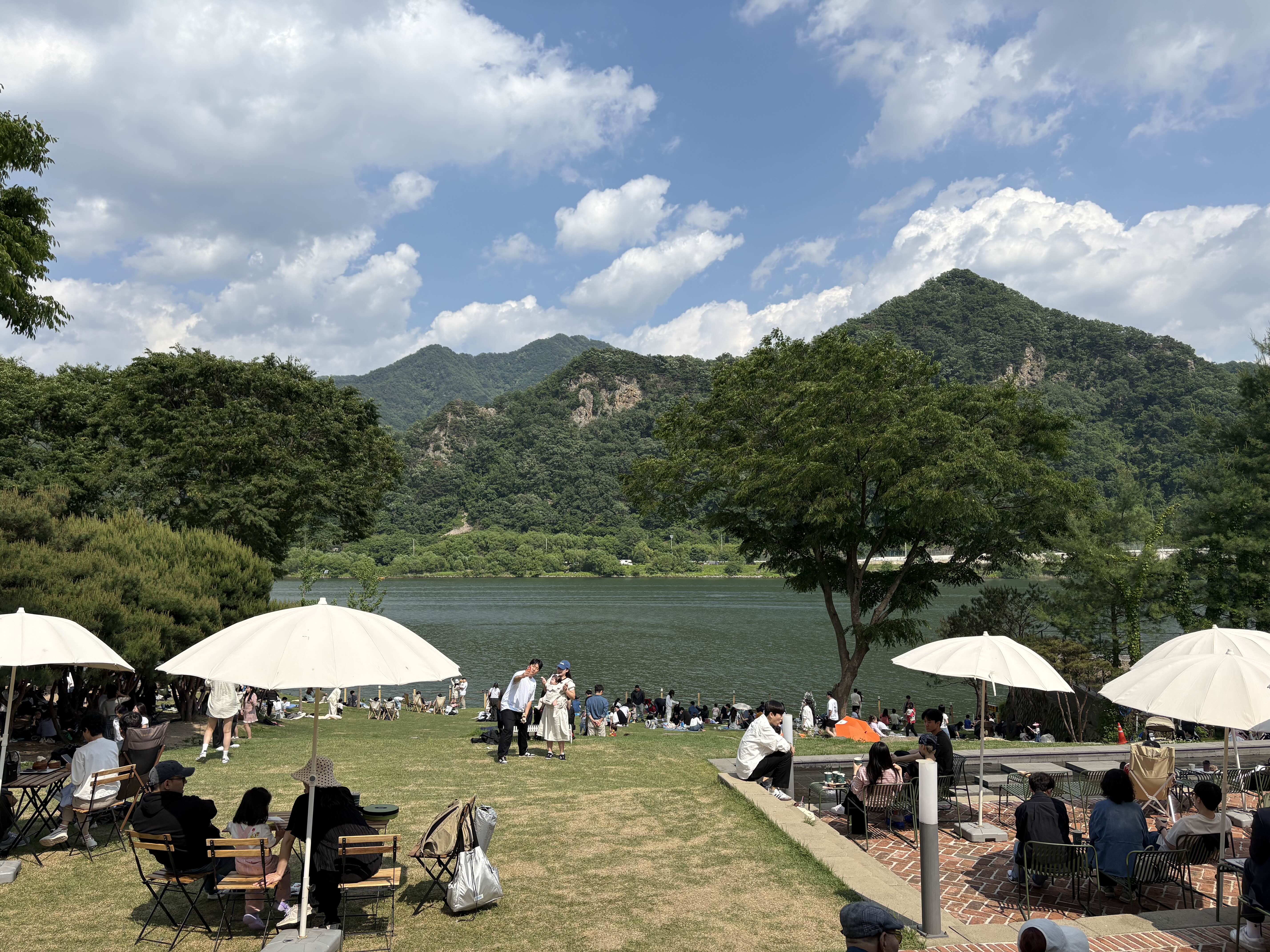 잔디밭에 앉아 제트스키나 워터스포츠를 즐기는 사람들을 바라보며 여유롭게 오후를 보내니,
