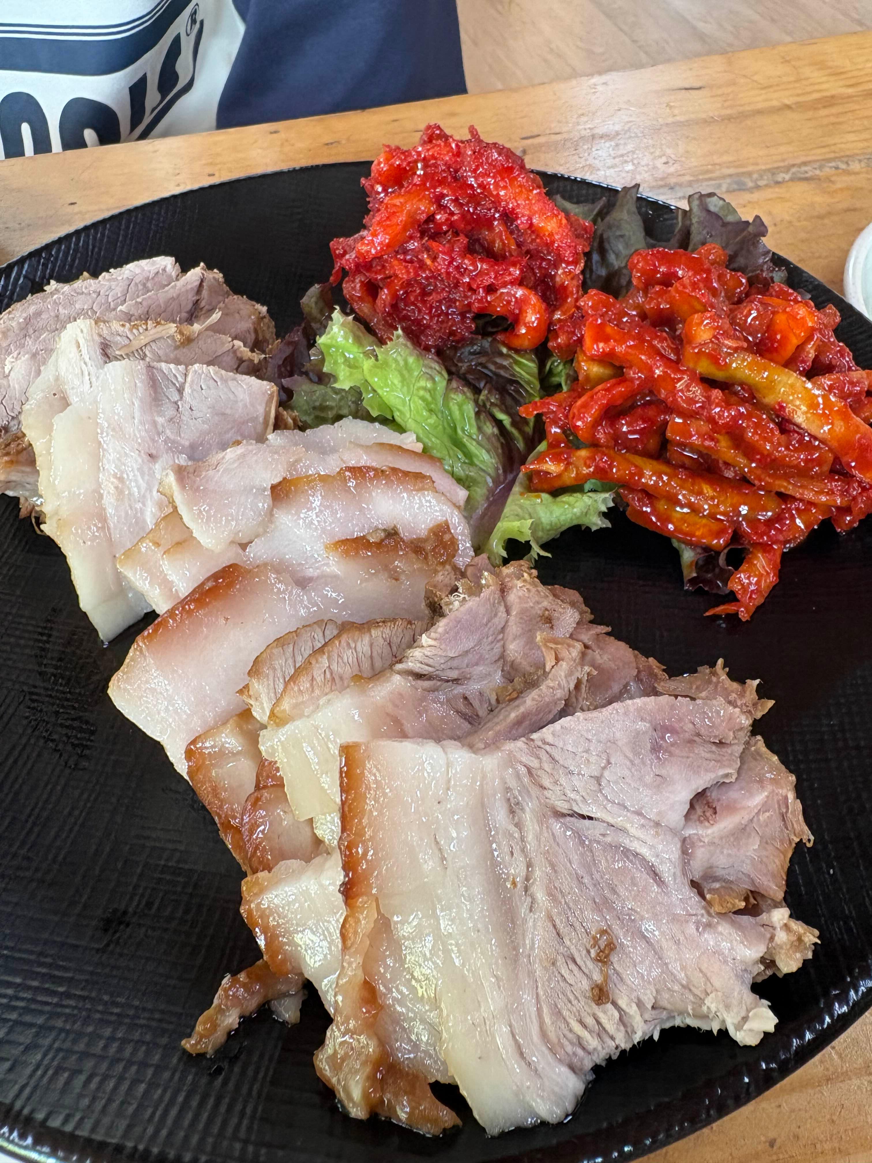 따끈따끈하게 데워진 수육은 지방과 살코기 비율이 딱 좋았고, 무엇보다 퍽퍽하지 않아서 끝까지 촉촉하게 잘 먹었어요. 곁들여 나온 달콤하고 매콤한 무말랭이 무침과 명태회무침이 정말 찰떡궁합! 특히 명태회 살짝 얹어서 먹으니, 막걸리 한잔 생각나는 그런 맛이더라고요.