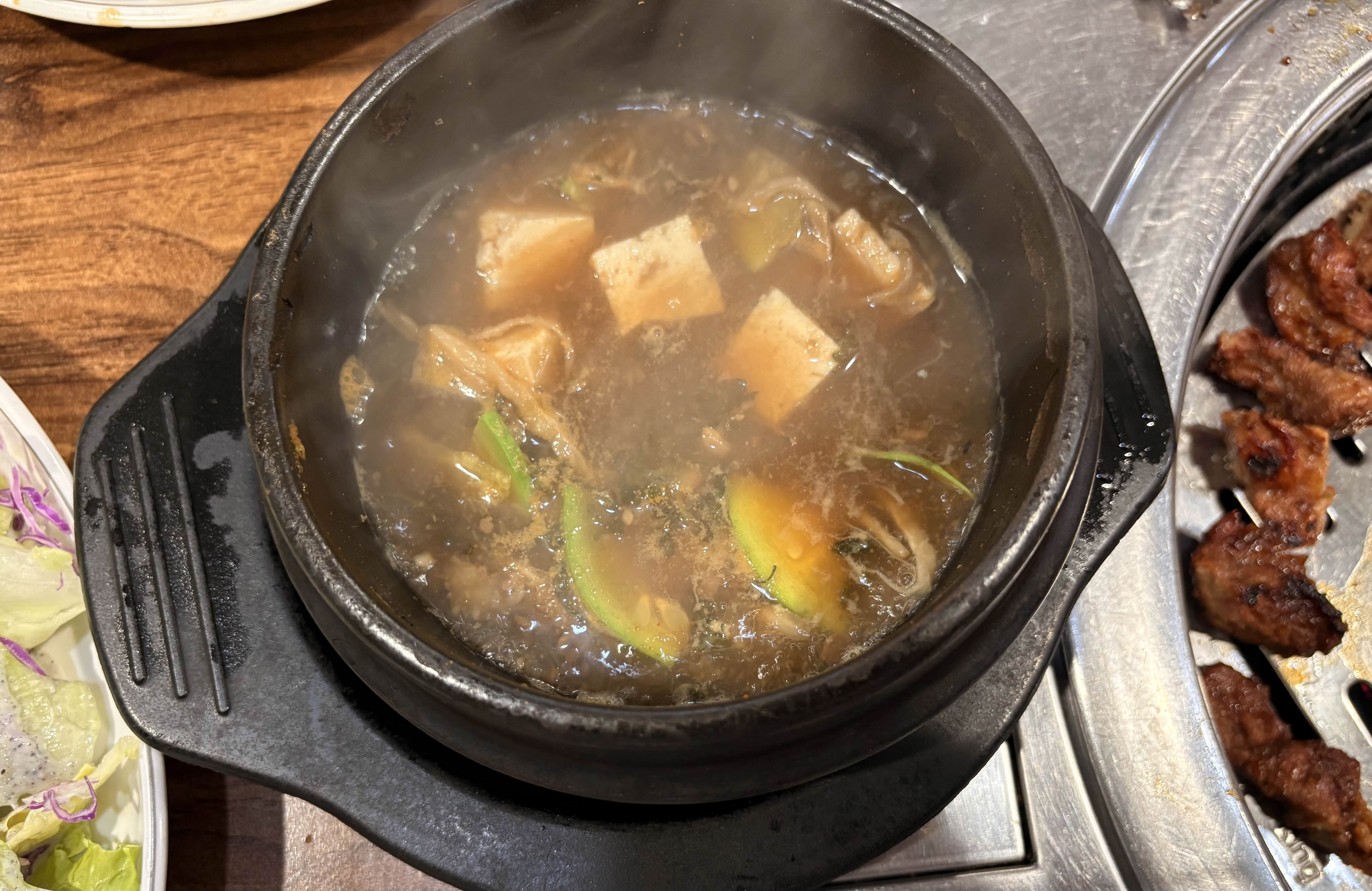 아기가 먹을 공기밥 주문하면서 나온 된장찌개. 아주 살짝 매운 맛이 있지만 5살 아이가 먹을 수 있을 정도의 맵기였다. 집된장을 사용해서 구수하고 달래와 두부, 호박이 들어가 있어서 고기와 곁들이기 아주 좋았다.