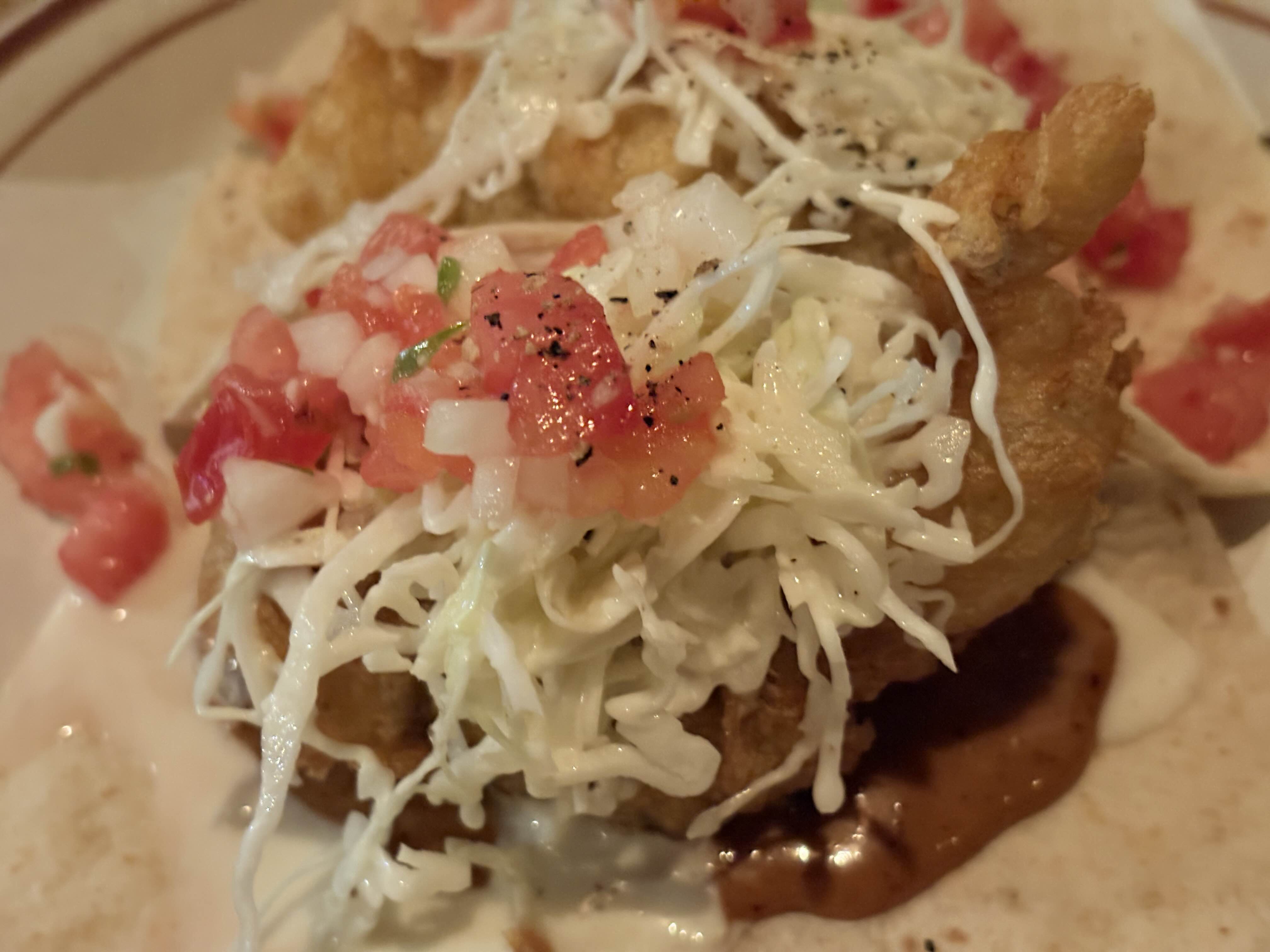 가장 먼저 나온 피쉬타코🌮. 아귀살로 만든 프라이드 위에 양배추 코울슬로와 찹토마토가 올라갔는데 치폴레 소스가 있어서 살짝 매콤하다. 고수 살살 뿌려서 먹으니 감칠맛 맥주가 바로 들어가는 맛있다.