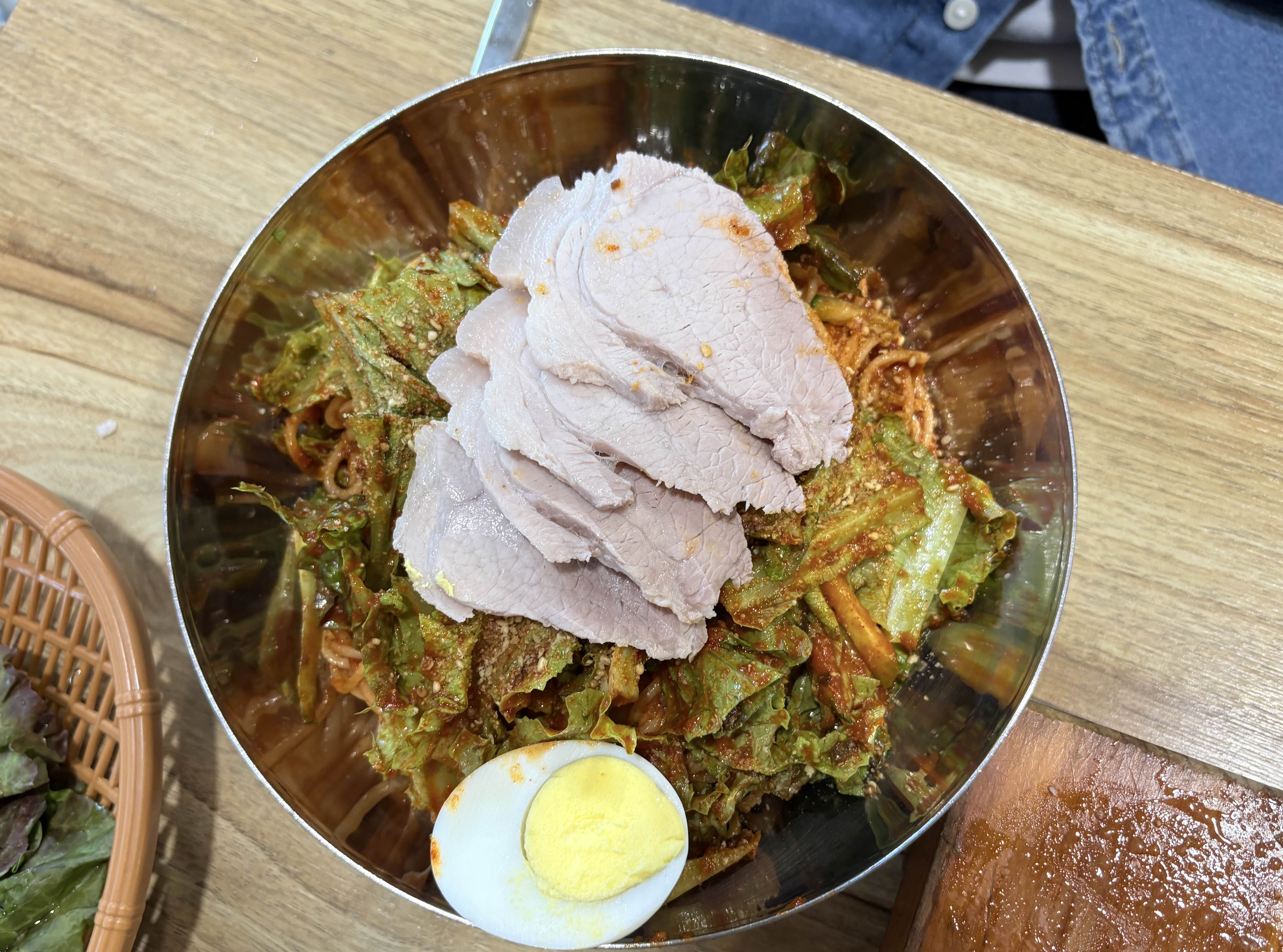 함께 나온 비빔국수. 이 또한 위에 고기가 한가득!ㅋㅋ 이집 고기 인심이 너무 후하다. 인기있는 이유가 이것인가? 비빔국수는 완전히 비벼짐 상태에서 고기 고명을 올려나오기 때문에 번거롭지 않고 양념이 고루 배어있어서 좋았다. 국수의 첫입은 약간 삼삼한 느낌인데 부족한 단맛이 고기고명과 함께 먹으니 채워지는 느낌이라 나는 비빔국수을 제일 맛있게 먹었다. 고명으로 올라간 고기도 지방이 적은 부위라 조금 덜 느끼했고.