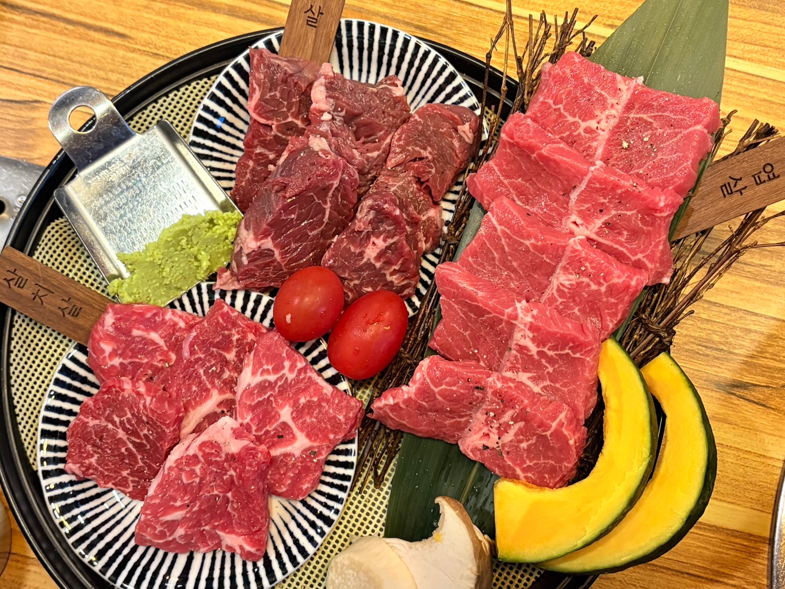 마블링이 살아있는 살치살. 살치살은 소금 톡톡해서 먹으니 맛있었는데 세가지 부위를 돌아가며 한 점씩 구워먹는 재미가 있었다.