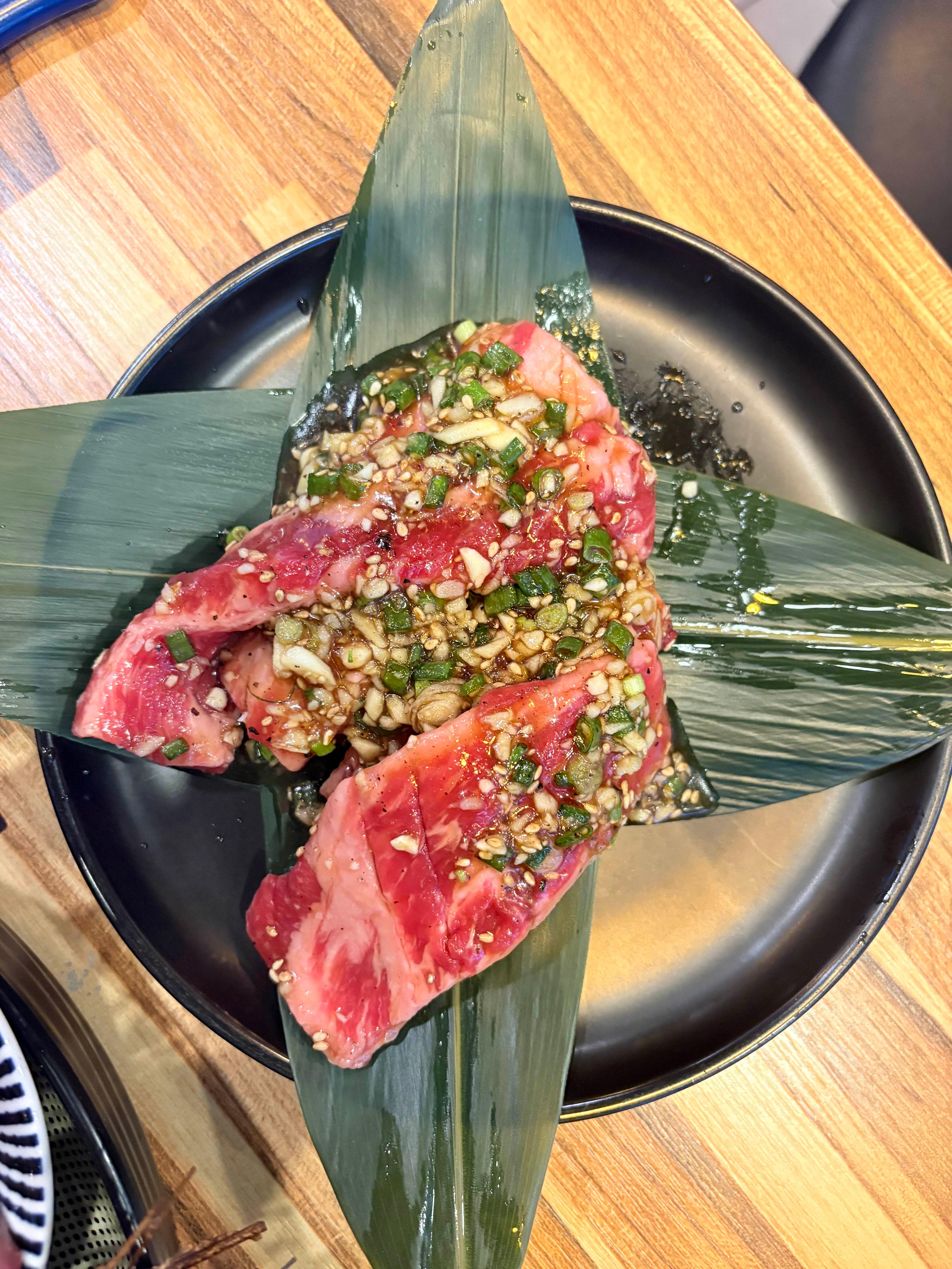 낙엽살 일명 부채살이라고 불리는 부위. 담백하고 부드러워서 아이가 맛있게 먹었다. 낙엽살은 살짝 구워서 와사비 올려먹으니 제일 맛도리 👍🏻