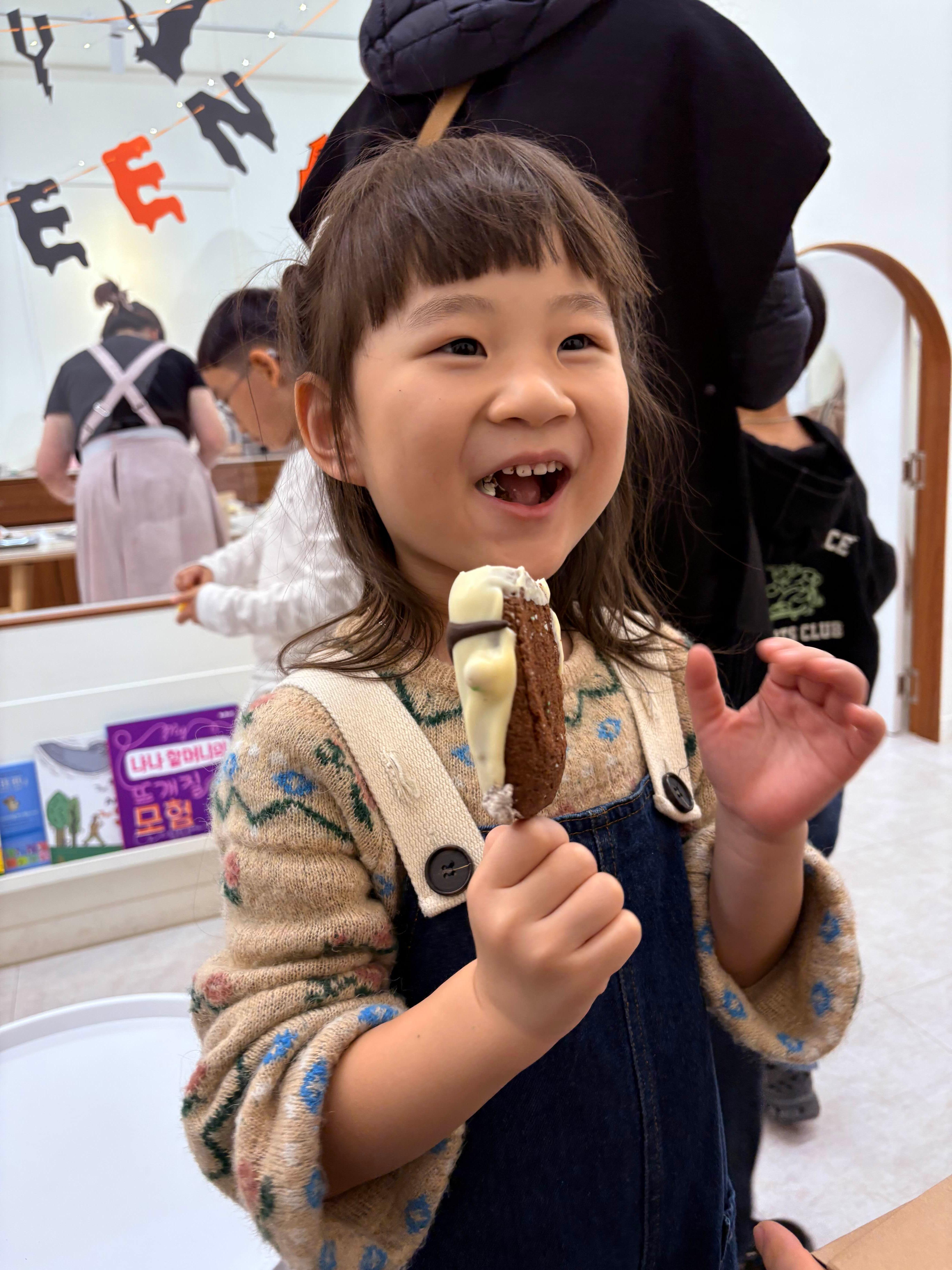주차장까지 걸어가는 동안 달달한 할로윈 팝씨클 케이크 먹으며 즐겁게 이동했다. 요즘 여러가지 체험 수업, 분리 수업이 많은데 키키봄은 찾아보니 시즌별로 수업 내용도 다양하고 실제 수업 만족도도 높아서 가끔 아이랑 한 번씩 와보면 좋을 것 같다. 5살부터 초저학년까지 이용하면 딱 좋을 것 같고 네이버 예약 페이지를 통해 수업 내용 확인하면서 아이가 좋아할만한 주제가 있을 때 한 번 씩 와보려고 한다.
