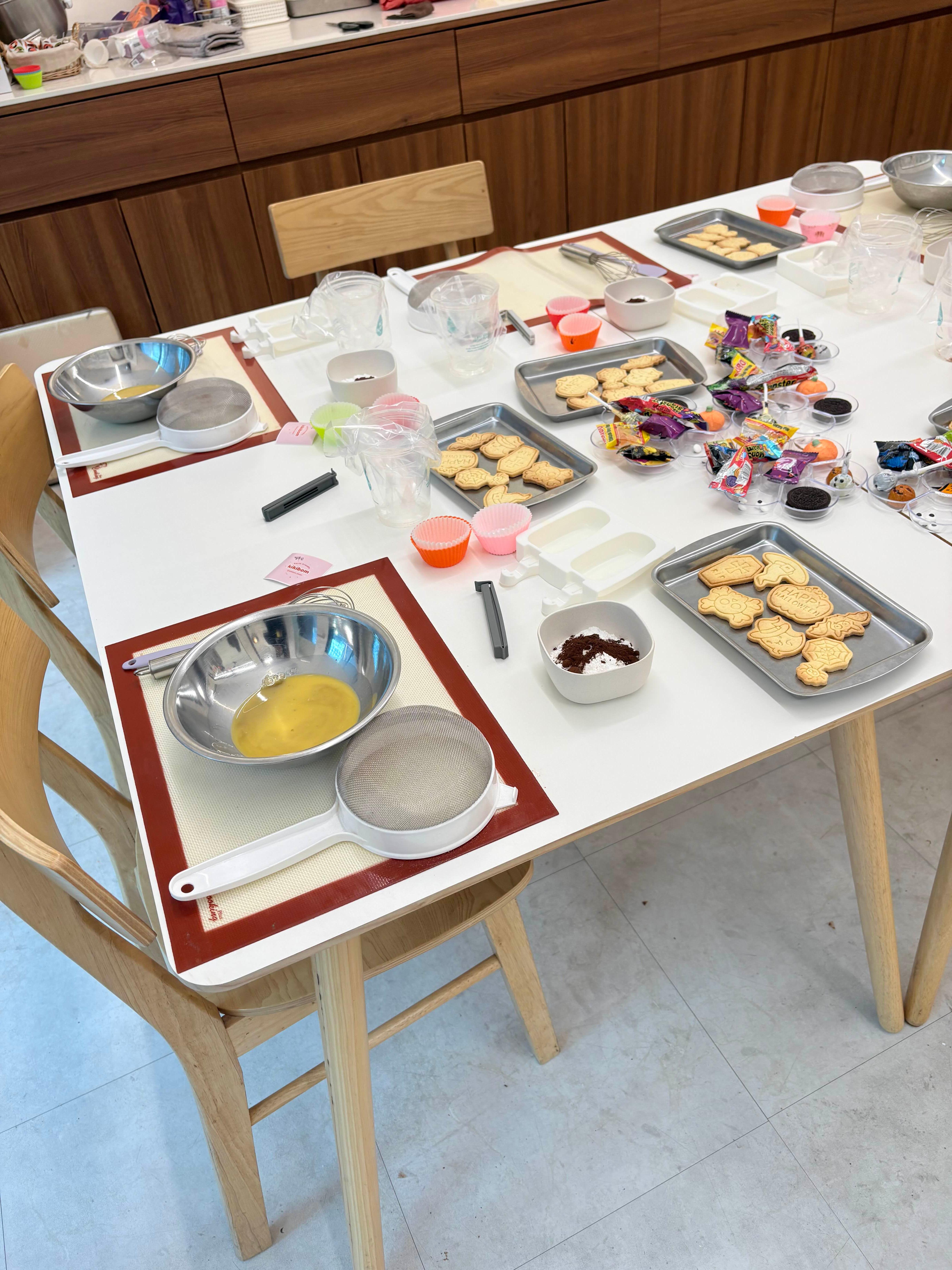 이번달 수업은 할로윈디저트박스여서 아이들이 진행할 1차 수업 재료들이 테이블 위에 세팅되어 있다.
